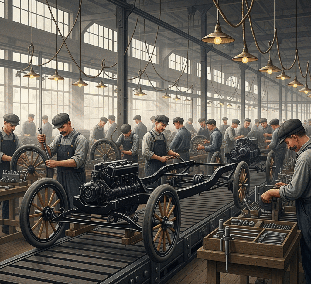 A Indústria 2.0, impulsionada pela eletricidade, trouxe a linha de montagem e a produção em massa para o primeiro plano. Pioneiros como Henry Ford aperfeiçoaram este sistema, que levava o trabalho até ao trabalhador e tornava acessíveis, a uma nova classe média, bens antes de luxo como os automóveis. Foi uma fase de alta velocidade e padronização, mas com um novo conjunto de custos.