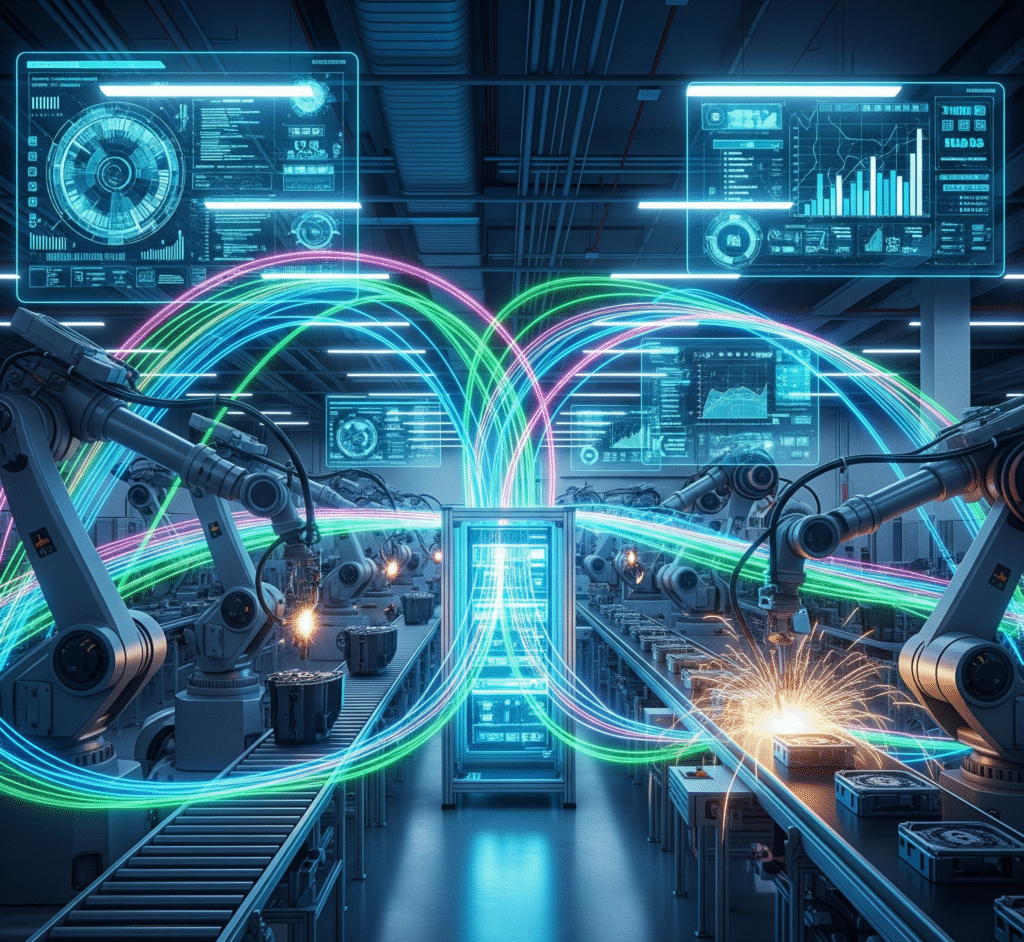 A Indústria 4.0 é a era das fábricas inteligentes (Smart Factories). A fusão de tecnologias como IoT (Internet das Coisas), Big Data e Inteligência Artificial cria um ambiente onde máquinas, sistemas e pessoas estão totalmente interligados. Os dados fluem em tempo real, permitindo uma automação inteligente e decisões mais rápidas.
